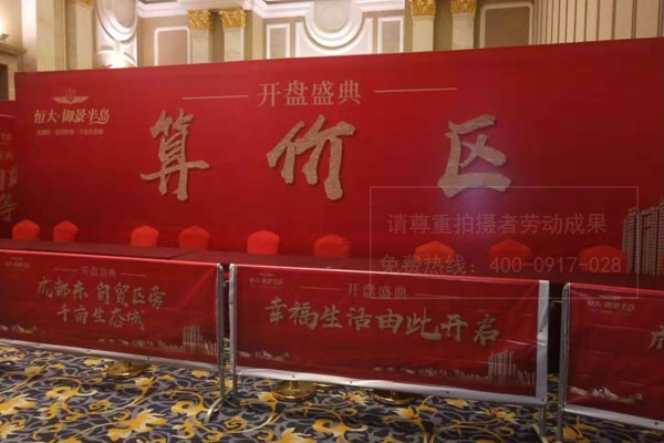 恒大地產(chǎn)御景半島開盤盛典算價區(qū)背景墻桁架搭建/路欄噴繪畫面制作安裝